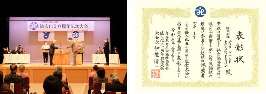 沖縄県与那原町社会福祉協議会から表彰されました 2023/03/30 沖縄県与那原町の社会福祉活動を推進することを目的に設立された与那原町社会福祉協議会が法人化50周年を迎えるにあたり、社会福祉に関する活動が優良で、他の模範となる取組として、弊社の社会貢献活動が表彰を受けました。 引き続き、地域やその地域で暮らす人たちに役立つ社会貢献活動を推進していきます。